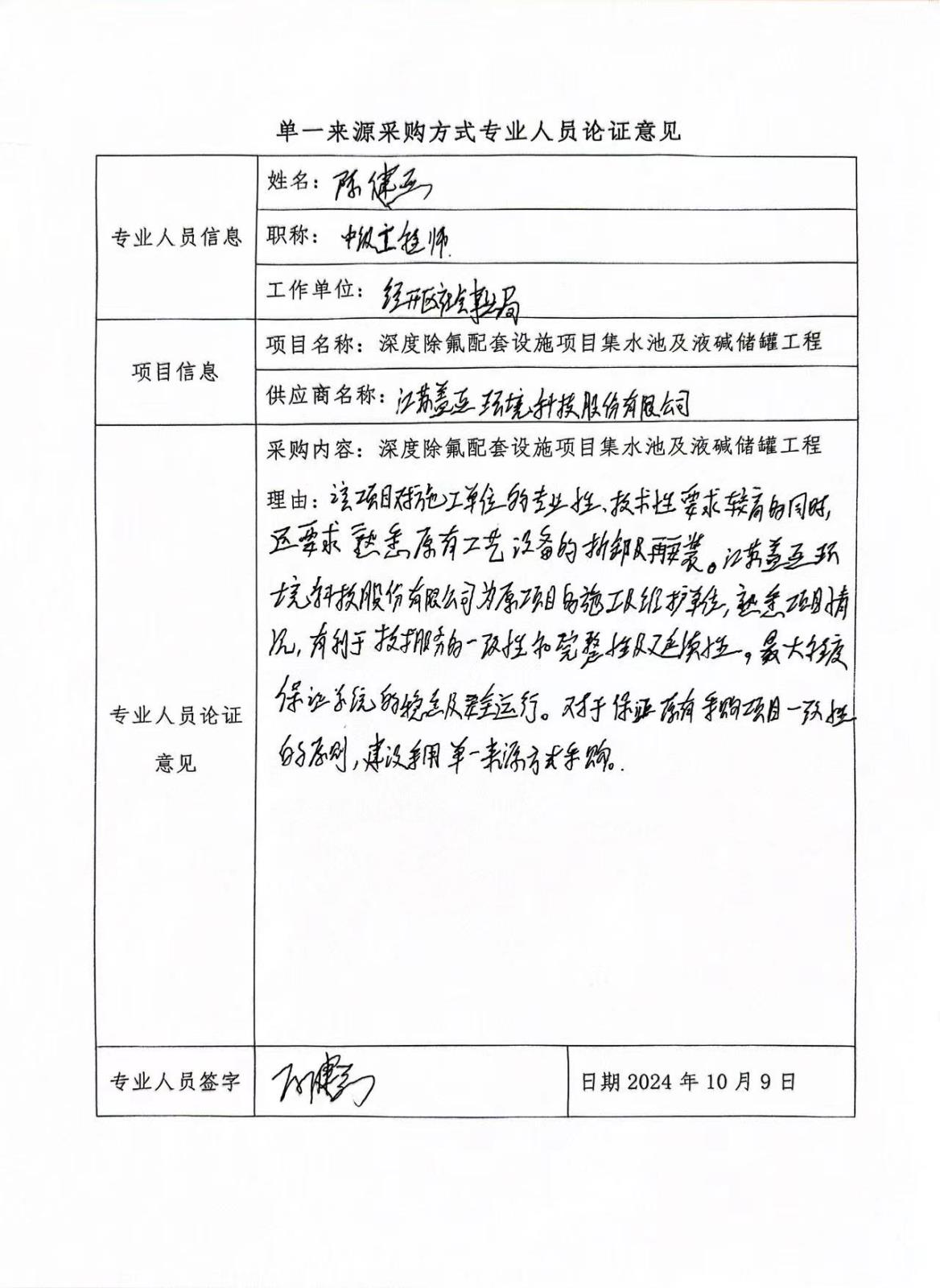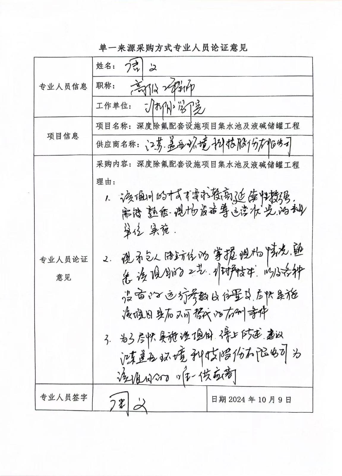 采用單一來(lái)源采購方式的原因及說(shuō)明:本項目是深度除氟配套設施項目集水池及液堿儲罐工程,為深度除氟配套設施項目配套項目,建設深度除氟分別需要滿(mǎn)足原有的0.8萬(wàn)m3/d、1.5萬(wàn)m3/d、1.5萬(wàn)m3/d、0.1萬(wàn)m3/d設計要求,設計集水池需要完全配合原有的“混凝沉淀+樹(shù)脂吸附”處理工藝,并且要求經(jīng)處理后廢水氟化物濃度≤1.5mg/L,本項目為降低水資源及周邊環(huán)境污染,對施工單位的專(zhuān)業(yè)性、技術(shù)性同時(shí)對原有工藝設備的拆卸再安裝要求較高;江蘇蓋亞環(huán)境科技股份有限公司為該項目的總承包單位,對該項目有豐富的維護經(jīng)驗,熟悉原有設備的運行參數及安裝位置條件,對再次安裝可以較為精準把控,能滿(mǎn)足招標人對工程質(zhì)量、服務(wù)響應速度的要求。江蘇蓋亞環(huán)境科技股份有限公司施工有利于保持技術(shù)服務(wù)的一致性和業(yè)務(wù)功能的延續性,特別是在數據安全性可以得到最大程度的安全保障,可以最大程度降低系統運行風(fēng)險,保證系統運行效率和穩定。故本項目由江蘇蓋亞環(huán)境科技股份有限公司負責實(shí)施,具有唯一性和不可替代性。