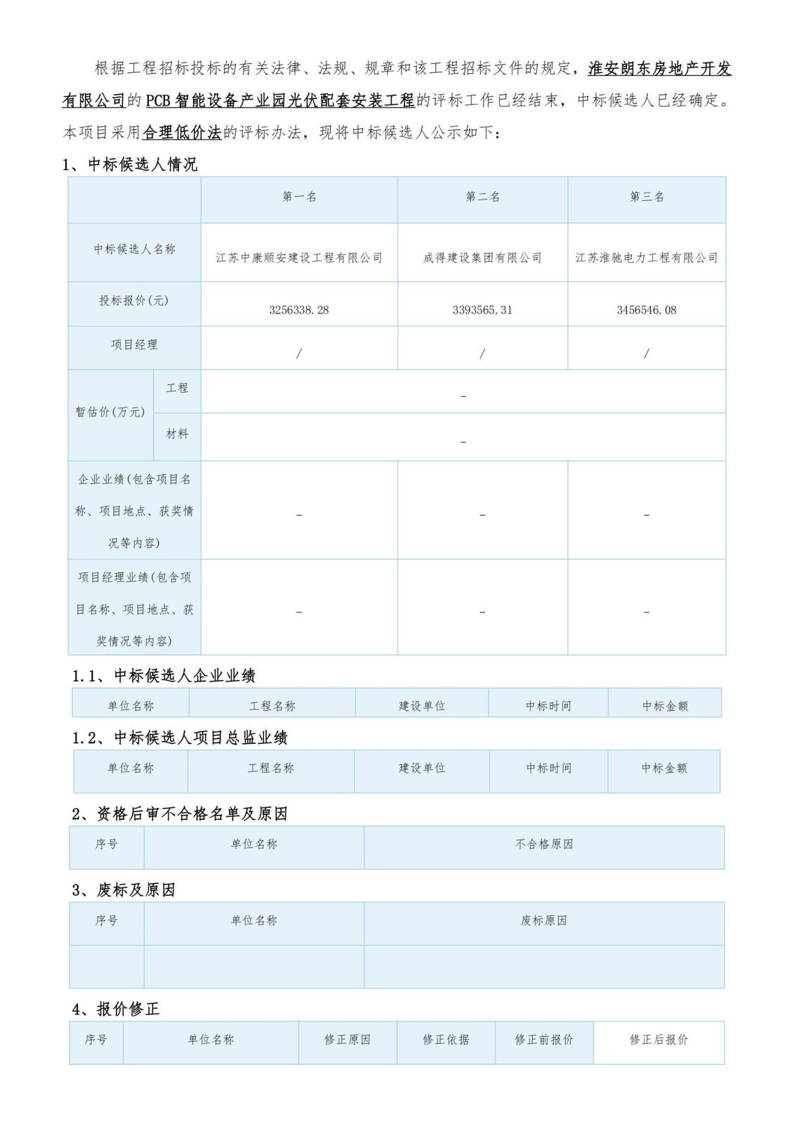 淮安朗東房地產(chǎn)開(kāi)發(fā)有限公司PCB智能設備產(chǎn)業(yè)園光伏配套安裝工程評標結果公示
