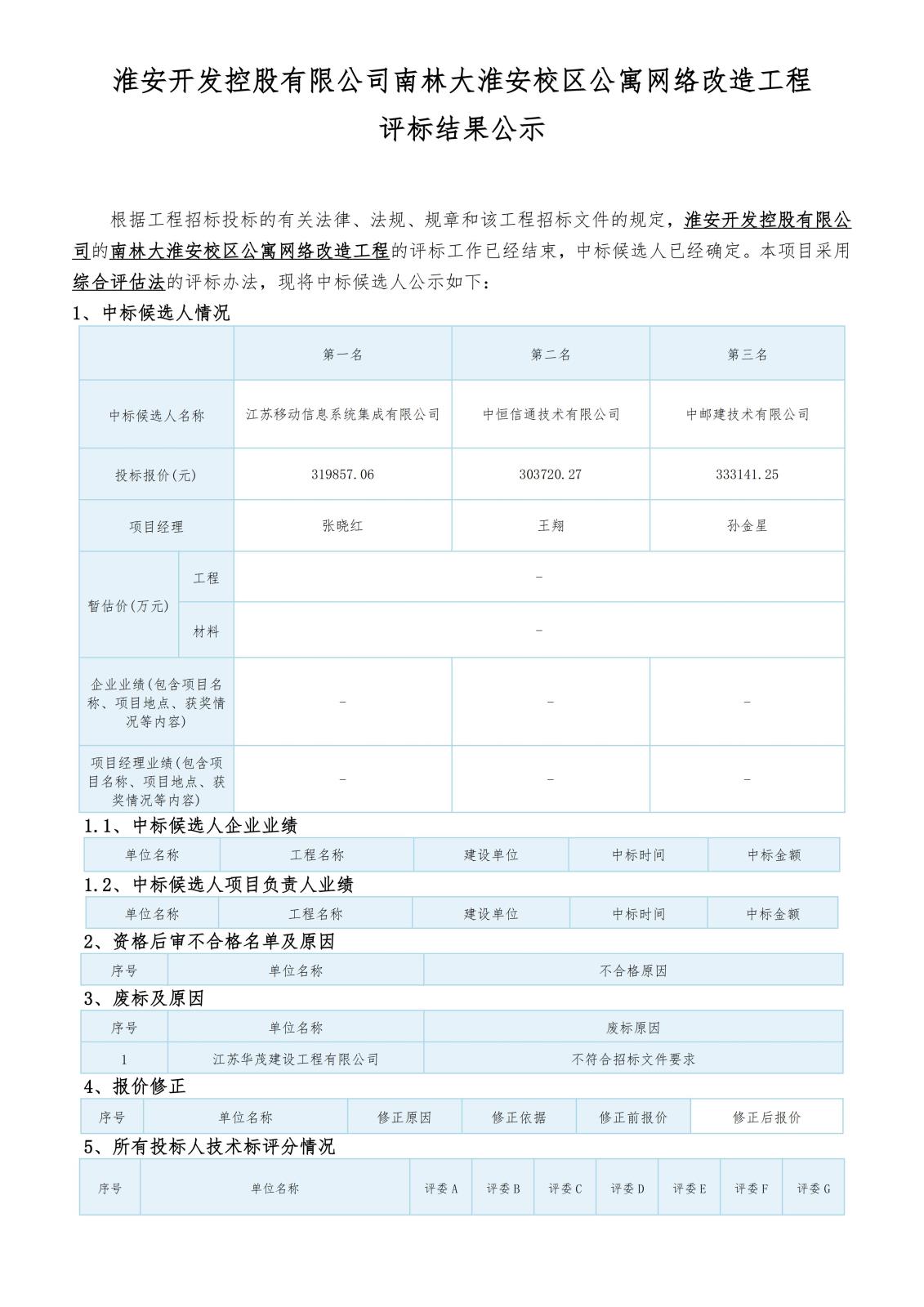 淮安開(kāi)發(fā)控股有限公司南林大淮安校區公寓網(wǎng)絡(luò )改造工程評標結果公示